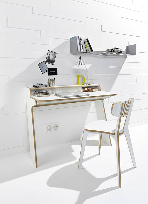 很多人都经常抱怨自己的生活空间太小,很多东西都放不下,其实如果能合理的运用自己的空间,你会感觉自己的空间慢慢的变得宽敞。Leonhard Pfeifer设计的这个节省空间斜桌可以靠在任何一个墙面使用,桌面虽然不大,但是每一块空间都能很好的被利用。纯白色的设计,会让你感觉更加的宽敞,倾斜的桌腿会给人一种向外扩充的感觉。