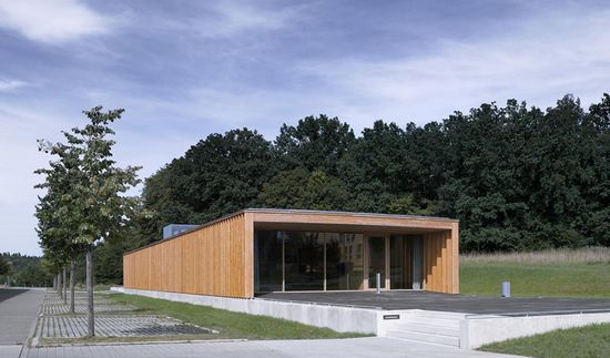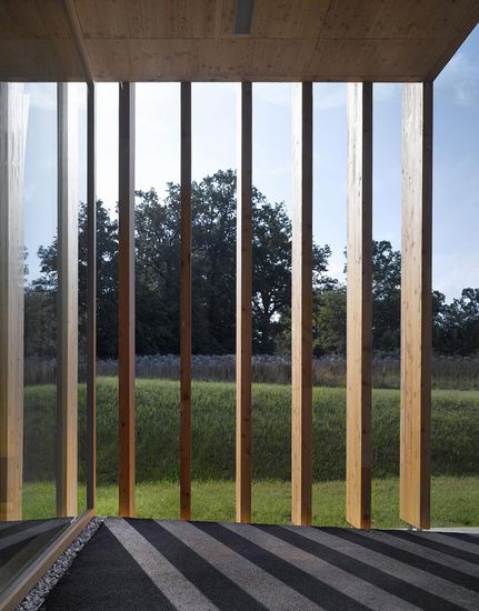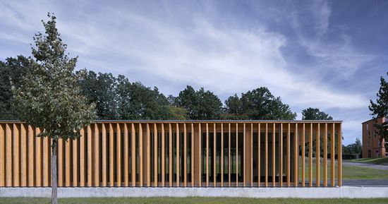窄而伸长的房屋位于树林和技术学院校园之间:这是一个新食堂,大约可容纳1200学生和教师。新食堂的修建丰富了校园建筑,也为学生们提供了聚会场地。外观主要采用落叶松木材和玻璃进行建造。在一排木板条加一个屋顶板条形成细长带开放式山墙端外墙。 食堂大厅缺少支柱支撑,设计师便添加了芯板,进行加固,外面是木质表层。屋顶也是木质的,采用许多木板条作支撑。白天的时候,光影交织,会呈现不同的外观效果。建筑结构比较平缓,建筑规格较高,而且和当地的环境相融合,十分和谐。