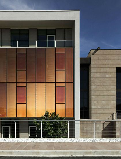 形式和线条坚持有序原则的几何形状,表面和外立面选用珍贵高新材料:这些是Gucci品牌有形的表达,在质量与时尚共存和历史传统,这是在该公司的新办公室外佛罗伦萨发现。 由厂房改建,楼高四层,紧凑的办公大楼是直接面对A1高公路走廊(意大利最重要的公路)和它的好处的高能见度由于立面的优雅和时代性:铜网片夹在玻璃板之间的捕获和反射阳光。每个面板不同的色调和色彩,这种最原始的材料产生了各种各样的色彩效果,无论是在应对自然或人工光源或从周围建筑不同的观点。