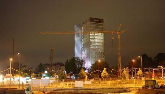 欧洲城市是新市区40公顷的总体规划直接到火车站北侧。总体规划将容纳一个艺术校园、码头、餐馆、住宅。这座为法国能源公司道达尔设计的建筑完成于2012年秋季,独特的高层建筑为道达尔德国总部的500多名员工提供了明确的标识感和身份认同。该项目高68米,共18层,包括入口大堂和餐厅,办公室,和技术层。可持续DGNB银证书早期目标导向的规划决策。这大部分是通过智能幕墙系统和能源再利用实现。
