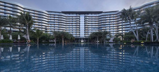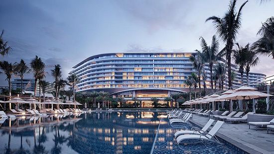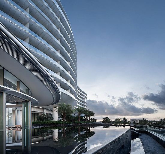 项目位于海南省陵水县清水湾的最东端。蓝天、碧海、白沙构成了基地优越的自然景观条件。近些年来,在海南新建的五星级酒店数量众多,竞争日趋激烈。如何在这些酒店中做出自己的特色,成为本次设计的核心任务。 相对于在热带地区建造东南亚建筑风格酒店的传统手段,设计师另辟蹊径,将酒店定位为现代、舒朗而又有滨海度假氛围的独特风格。在设计过程中,抛弃大多数度假酒店惯用的将建筑面向海面围合出花园的方式,独具匠心地单用一条简单曲线,使得酒店几乎所有客房均直面大海。对此,酒店管理公司赞赏有加,并称其为最好的利用海南海景的五星级酒店。在此基础上,结合海南当地气象环境——海风,设计师又把这条曲线抬离地面8m,形成令海风穿行其间的通道,创造出各种功能区域的同时,也为其提供了良好的自然气候。