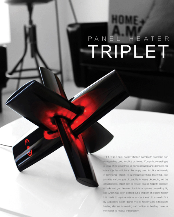 在寒冷的冬天,用户一般都很少出门,有些人甚至会整天躲在被窝里或者呆在壁炉旁不出来。但是为了正常的生活和工作,大部分人都不能这么做,为了让用户能够在寒冷的冬天得到足够的温暖,Kang Min Seung设计了这个三联体加热片。它是由四片可以发热的电热板组成。独特的插接方式,使得它的造型格外的时尚,就好像是一个精致的艺术品。它可以为周围很大的空间提供温暖,将它放在你的书桌上或者办工桌上,你会感觉非常的温暖,舒服。