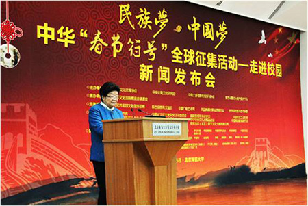 2014年10月15日,中华“春节符号”全球征集活动——走进校园新闻发布会在北京师范大学召开。中华“春节符号”全球征集活动组委会名誉主席、第十届全国人大常委会副委员长、中国关心下一代工作委员会主任顾秀莲提出,必须重视青少年学生参与中华“春节符号”的征集活动,强调了青少年参与征集活动的重要性。她认为:“办好中华‘春节符号’全球征集活动,必须要重视青少年在这一活动中的作用,发挥青少年思想活跃的优势,以征集活动为契机,在青少年当中普及中华优秀传统文化,培养出了解、热爱中华优秀传统文化的建设者和接班人。” 此次发布会,北京师范大学党委副书记刘利,组委会执行副主席、国家新闻出版广电总局规划研究院党委书记万顺府,组委会执行副主席、东方华夏遗产保护中心主任乔申乾等出席并发表讲话。来自文化学界的相关专家和中外媒体记者以及北京师范大学师生代表等200余人参加。 发布会上,国际亚细亚民俗协会会长、国家非遗专家委员会委员、中央民族大学教授陶立璠和清华大学美术学院副教授平面设计系统开发研究所所长陈楠分别做了精彩讲座。陶立璠教授从春节节物及文化内涵方面对春节民俗文化进行了详细解说,并从春节门神、对联、年画、剪纸窗花、烟花炮竹等方面,生动翔实的解析了春节民俗文化的深刻内涵与表征意义,给莅临嘉宾及广大师生带来了一次春节民俗文化知识的洗礼。陈楠副教授则专业设计角度,立足中国传统文化,对比中西方多元设计元素与精品力作,从格律设计观出发,开展了以“中国传统文化符号的视觉设计研究”的主题讲座,并表示愿设计出单个符号或多个符号系统,与广大师生和社会各界人士积极参与中华“春节符号”的设计。