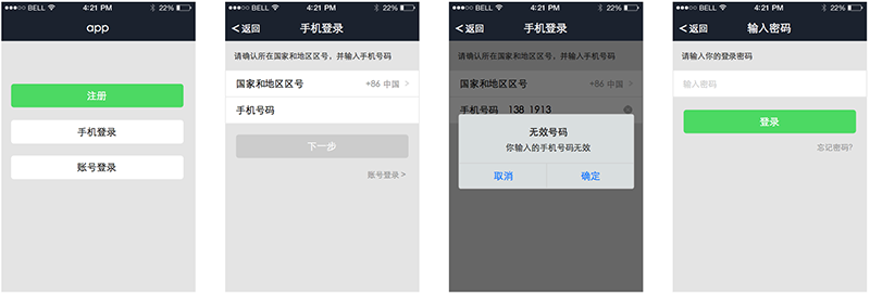 以此控件为基础,在之前提到的app登录注册例子,快速组件高保真原型,如下图: