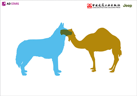 广告标题:吉普车系列广告——布西曼族人与爱斯基摩人 / 哈士奇与骆驼 / 冰雪鞋与登山鞋 广告简介:每张图中不同颜色的两种形象分别代表不同的气候与地貌:棕色的非洲南部的布西曼族人、沙漠地区的骆驼、户外登山鞋代表最炎热的热带地区、山地的气候与地貌;天蓝色的北极的爱斯基摩人、西伯利亚的哈士奇与带冰爪的户外登山鞋代表最寒冷的寒带的地貌与气候。两种颜色重合的部分呈现出不同坡度的吉普车,体现了吉普车可以在任何地理与气候条件下穿越的高性能。