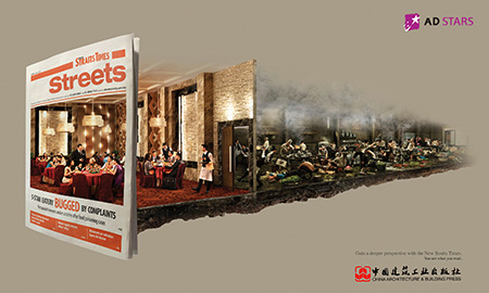 广告标题:厨房 广告客户:《新海峡时报》 广告简介:为了改变人们对《新海峡时报》的坏印象——政府的喉舌、缺乏深度,广告设计采用全景视点,来显示《新海峡时报》上的文章可以带给人们意想不到的更深的视角。