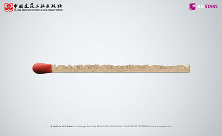 广告标题:火柴 广告客户:马卡迪(Makati)消防站 广告简介:马尼拉作为世界人口最为稠密的城市之一,该火柴上有象征整个城市的建筑微雕。干燥的夏季到来,火灾对个人、家庭和整个社区都是个威胁。马卡迪消防站的这一广告告诉人们都市的火灾,不仅影响个人、家庭,还影响整个社区,这一时期要格外重视防火。