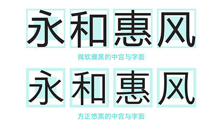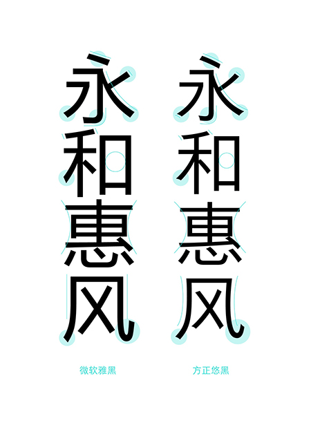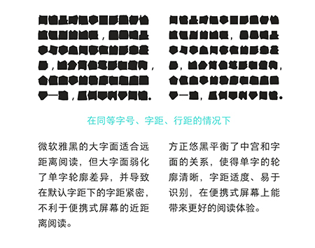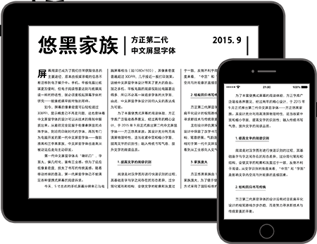 今天,5寸左右的手机屏幕像素数量已与电脑屏幕相当(如1080x1920),其像素密度普遍超过300PPI,几乎接近一般打印效果。这给中文屏显字体设计带来了更大的自由。加之手机、平板电脑的阅读视距比电脑要近得多,所以不必再一味追求字体的大字面,由此,中文屏显字体设计回归人文的表达成为可能。 为了丰富便携式屏幕的阅读体验,方正字库广泛吸收各界意见,经过两年的精心设计,于2015年9月正式推出第二代中文屏显字体——方正悠黑家族。其设计充分利用高清屏物理特性,适当收紧中宫和缩小字面,提高文字的识别性;融入传统书写气息,提升文字的阅读品质。