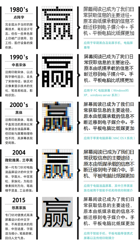 屏幕阅读已成为了我们日常获取信息的主要途径,原本由纸媒承载的信息不断迁移到电子媒介中。手机、平板电脑比纸媒更加便利,但电子阅读想要达到与纸媒阅读一样的舒适性,就必须重视起屏幕字体的研究——就像纸媒早前所做的那样。 如今,屏幕的像素密度可以轻松超过300PPI,显示精度已不再是问题,这也意味着中文屏显字体的设计可以从技术的限制中解脱出来。从最初完全屈服于低像素屏显的点阵字,到沿用印刷时代的字体,再到专门为电脑开发的第一代中文屏显字体——微软雅黑和兰亭黑家族,中文屏显字体也逐渐从被动适应走向主动研发。