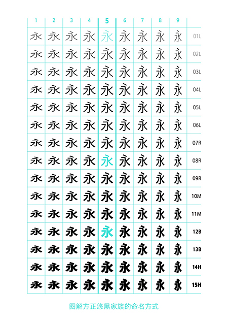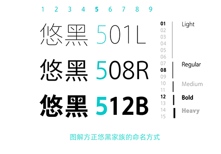 方正悠黑家族由135款字体组成。由于家族庞大,为了易于辨别,字体的命名方式采用了数字编号系统。 纵轴(1-10)从左至右表示字身的扁和窄,其中“5”为常用标准方块字体;横轴(01-15)从上至下表示字重的变化,并采用西文字体字重的缩写名称对其进行分类(如01=Light,07=Regular,10=Medium,12=Bold,14=Heavy)。尤其在印刷媒介,能更好地引导设计师把悠黑与其它西文字体的字重进行配比使用。