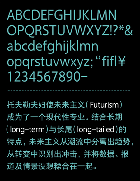 1. 为了配合方正悠黑的笔形风格,专门设计了全套的英文字体和符号,不同字重的英文字体在与中文混排的时候更加协调一致。