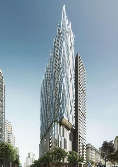GBL建筑师设计的“8X大厦”已经获得了在温哥华的建造批准,将在秋天开始动工。该场址位于查理德港湾的西部角落和温哥华耶鲁镇 的Helmcken街附近。该建筑设计理念结合了周边三个区域的背景环境:埃默里·巴恩斯公园,场址两侧的西部边缘;附近的街道;耶鲁镇的天际线,显示了广泛的建筑风格。 35层高、365000平方英尺(33910平方米)大厦的外观带有相交叉的隐藏式的脊柱。该建筑的基地还挤压出了附近体量规模类似的布鲁克兰法院。公园边界的体量是上下两层高,从而使得这三个体量分别以自己本身独特的特点来回应场址的背景环境。