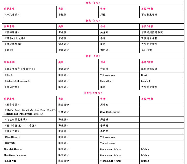 第二部分:“丝路精神—首届西部国际设计双年展”获奖名单 (含专业组、学生组、论文组、优秀组织奖、优秀指导教师)