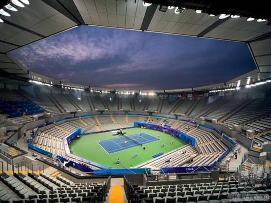 北京奥林匹克公园国家网球中心——占地面积16.68公顷,拥有30片国际标准比赛场地(其中室外场地17片,室内场地12片,包括两片符合国际赛事标准的红土场)和一座屋顶可开启的钻石球场。钻石球场”设计方案体现了“绿色、人文、科技”三大设计理念,得到了评审专家的一致认同,难能可贵的是,新建的球馆(钻石球场)延续并发展了原有球馆(莲花球场,映月球场等)的建筑风格,坚持了当初的规划和理念。使得国家网球中心现有三个主球场在建筑风格上的呼应。视觉上,在奥林匹克公园北区形成错落有致的低尺度建筑群。