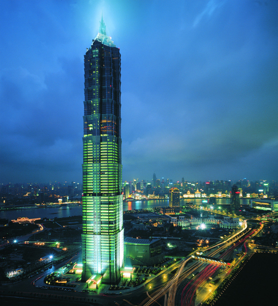 上海金茂大厦(Jinmao Tower)(1999年竣工),位于上海浦东陆家嘴金融中心。这是一座集现代办公、五星级酒店、会展中心、娱乐与商场等功能于一身的当代建筑综合体。它以其特有东方美学的特质屹立在世界摩天大厦的楼群之林。其建筑形态与立面的艺术表达,让人感受到了中国古塔形态意韵的当代转型与创新,并且巧妙地同现代建筑功能与技术相结合,它带给了中国摩天建筑形态的设计以教科书般的启示。