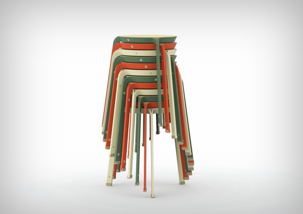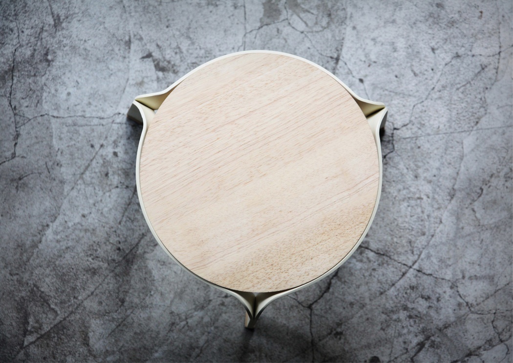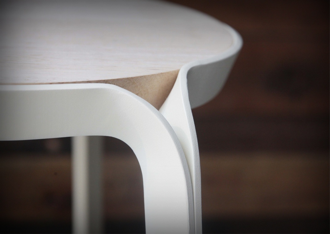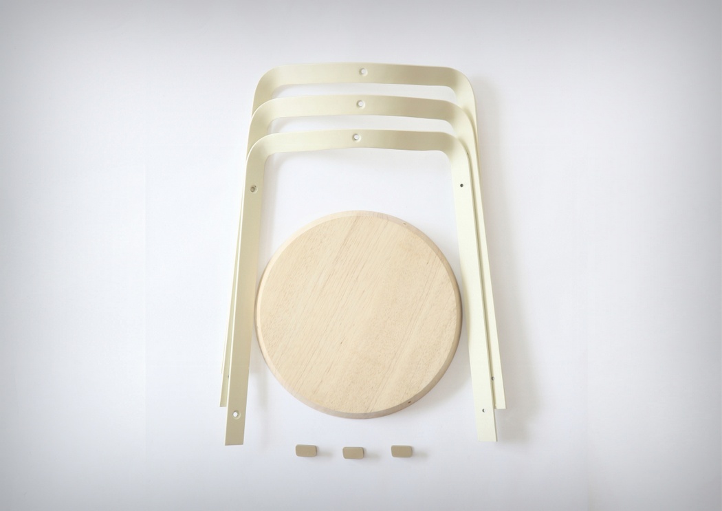 这款凳子不论功能还是外形都很简单,但其设计有着独到之处。它由三片曲杆支撑起凳面,凳腿有扣子包裹,安装和拆卸都非常简单。