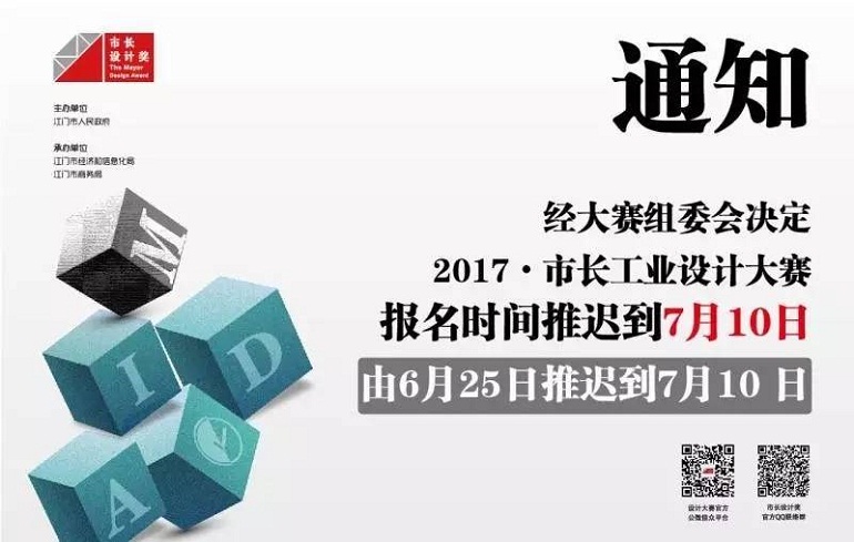 【通知】经大赛组委会决定2017·市长工业设计大赛报名截止时间由6月25日推迟至7月10日!望设计师们踊跃报名!