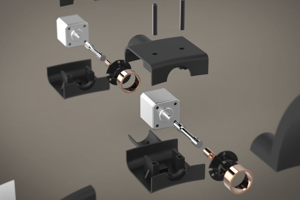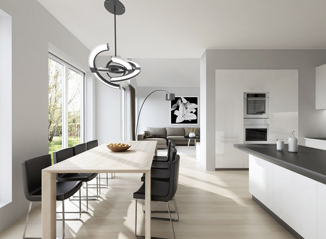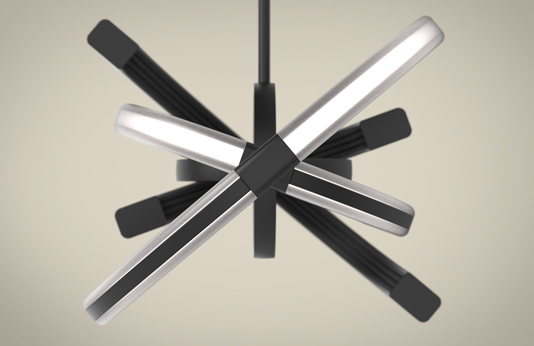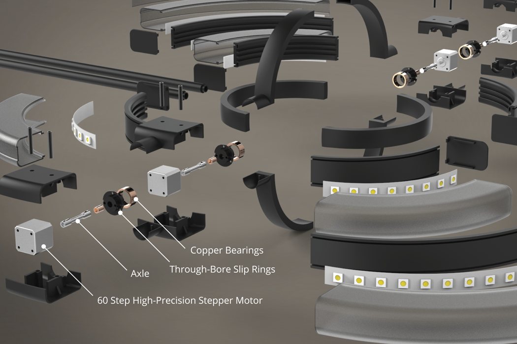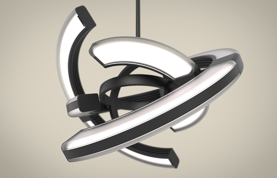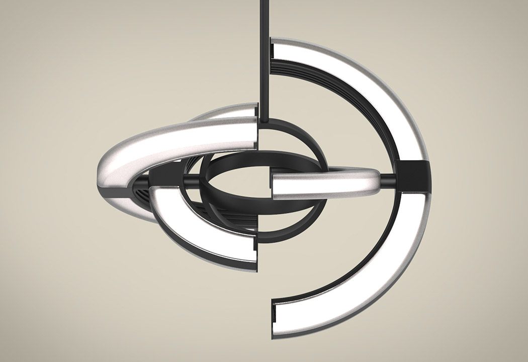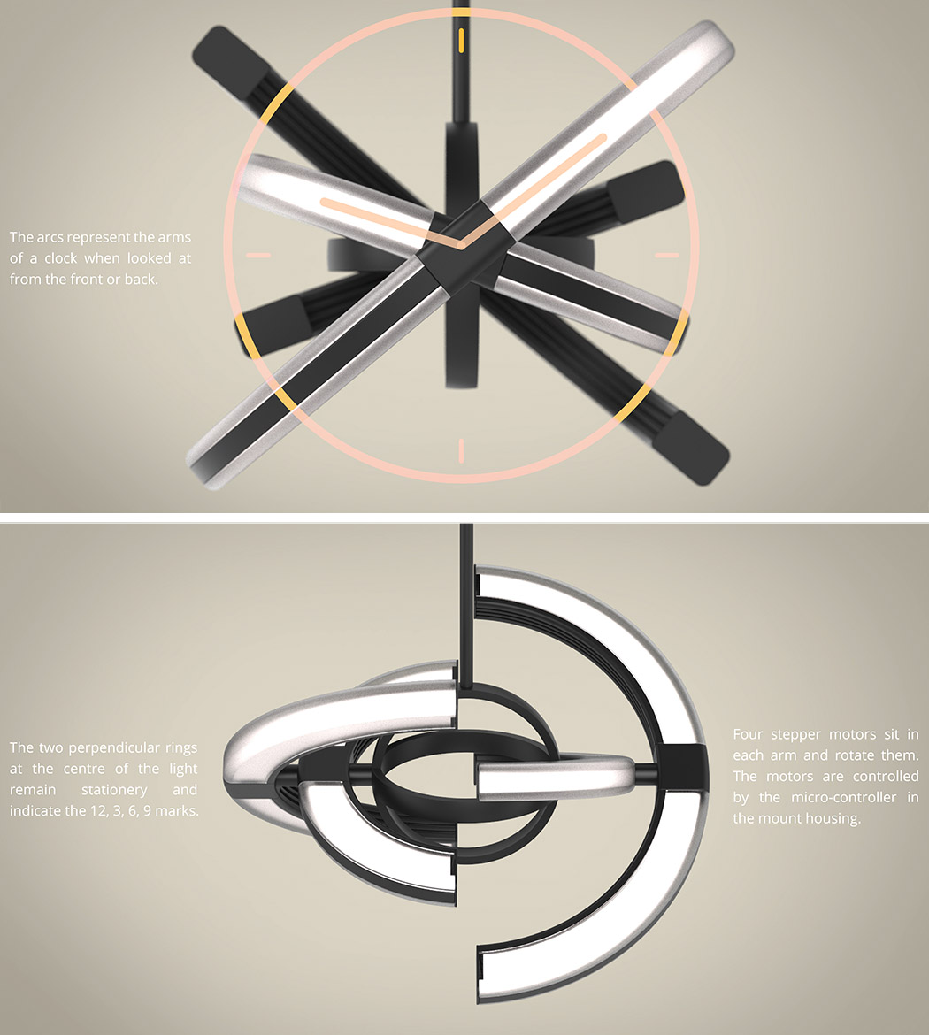 作为吊灯时,Saturn 的确无所谓角度,但在作为挂钟时,就要从正面或后面来看——在这两个角度,我们会看到大、小灯管未被黑条遮挡的发光部分充当了分针和时针,而中央两个圆环形成的十字刚好指出了 12 点、3 点、6 点和 9 点方向。四根灯管/表针均由步进电机驱动,而这些电机由位于安装座内的微控制器控制。