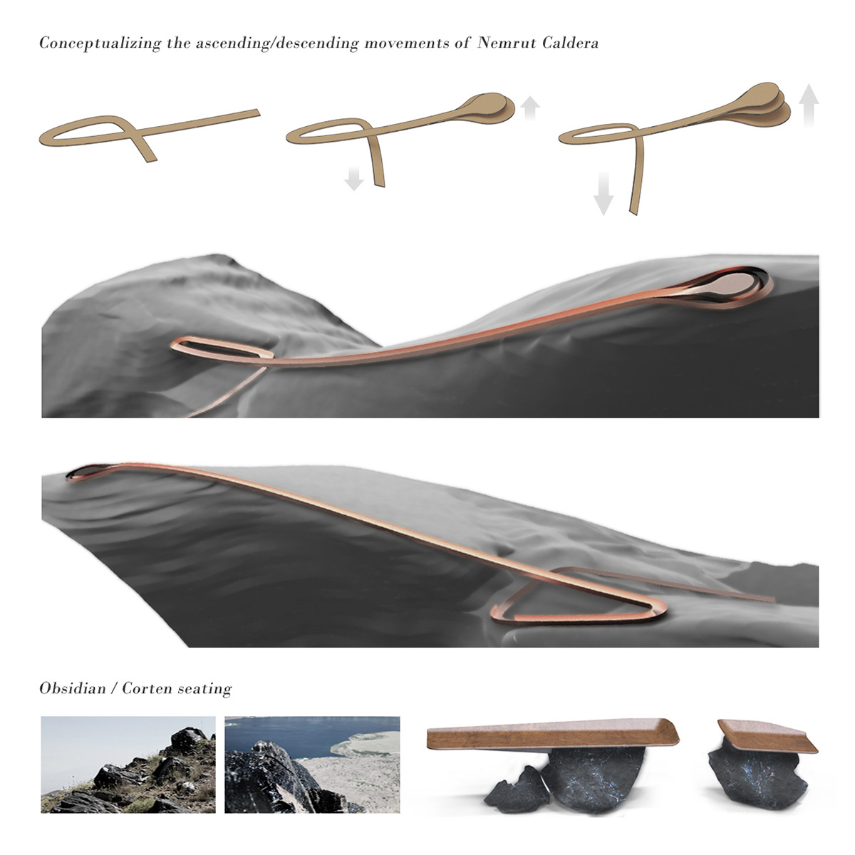 土耳其Nemrut Volcano火山现在处于休眠和平静之中,曾经是一个巨大的破坏引擎。 经过数千年的地震,火山爆发,构造崩溃和眼泪; 这个古老的地狱平静下来,成为了大自然,运动和时间的巨大纪念碑,现在里面包含一片宁静的伊甸园。 这意味着Nemrut的旅程尚未完成; 它的故事仍然在被写入,而它正在被内部和下方的动作不断地雕刻。 Nemrut Caldera观察路线被设计为Nemrut Caldera连续运动和持续旅程的体现。 它不是具有单一视点的单一平台,而是一条观察路径,提供具有各种视点的旅程。 访客并不局限于单一平台上的恒定点,他/她是一个活跃的观察者,可以自由移动并且能够拥有不受限制的全景视点。