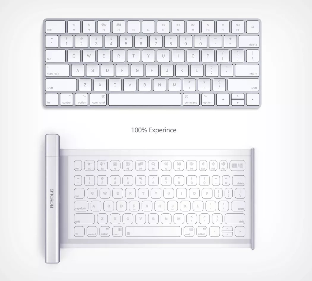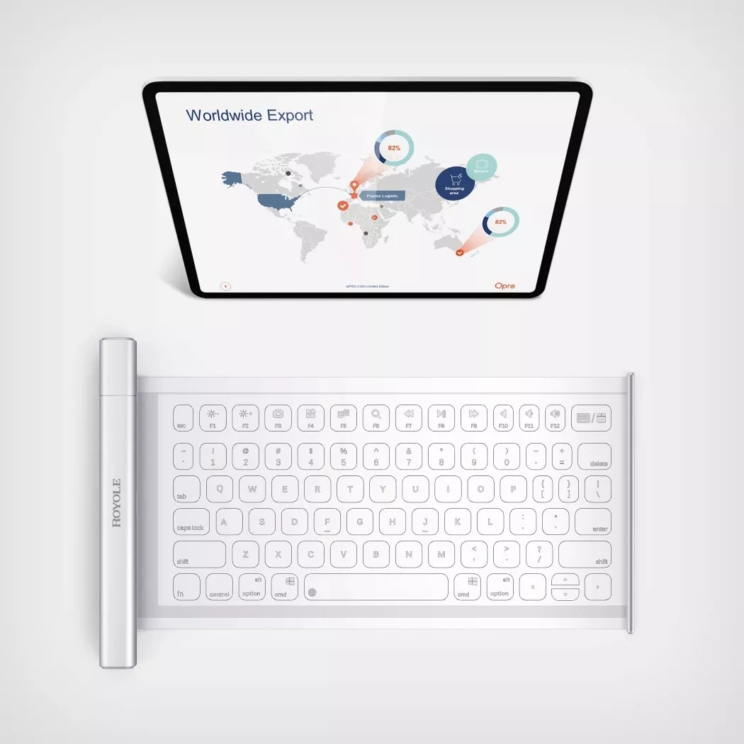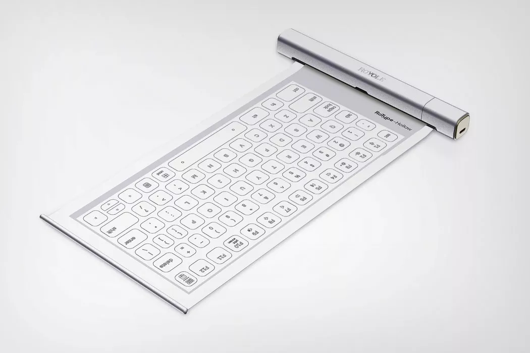 RoType 是一个整洁的,可滚动的柔性键盘。通过无线方式连接到任何设备上,让你只需触摸按键就可以轻松打字。RoType 使用含有隐藏电路的特殊胶片,厚度为0.04mm,可多次伸展和卷曲。当不使用时,它就会滚回到Rotype坚固的金属外壳中,方便随身携带。