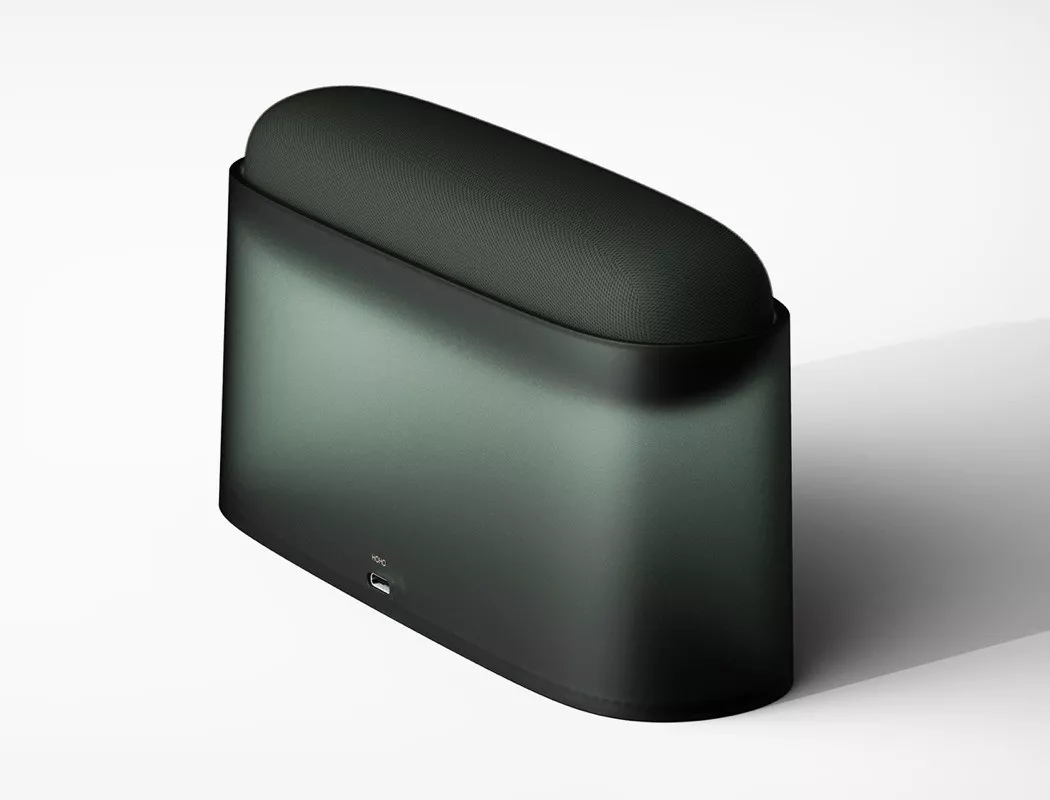 话筒和音箱的结合产品,产品分两部分,一是主体话筒扬声器,另一个是底座。主体造型简简单单,去掉冗杂的按键和结构,圆润造型包裹内部的话筒和音箱结构件。底座分为两种,一是半透磨砂亚克力底座,支持给主体充电,增强重低音效果,另一种仅支持充电,比较扁平。