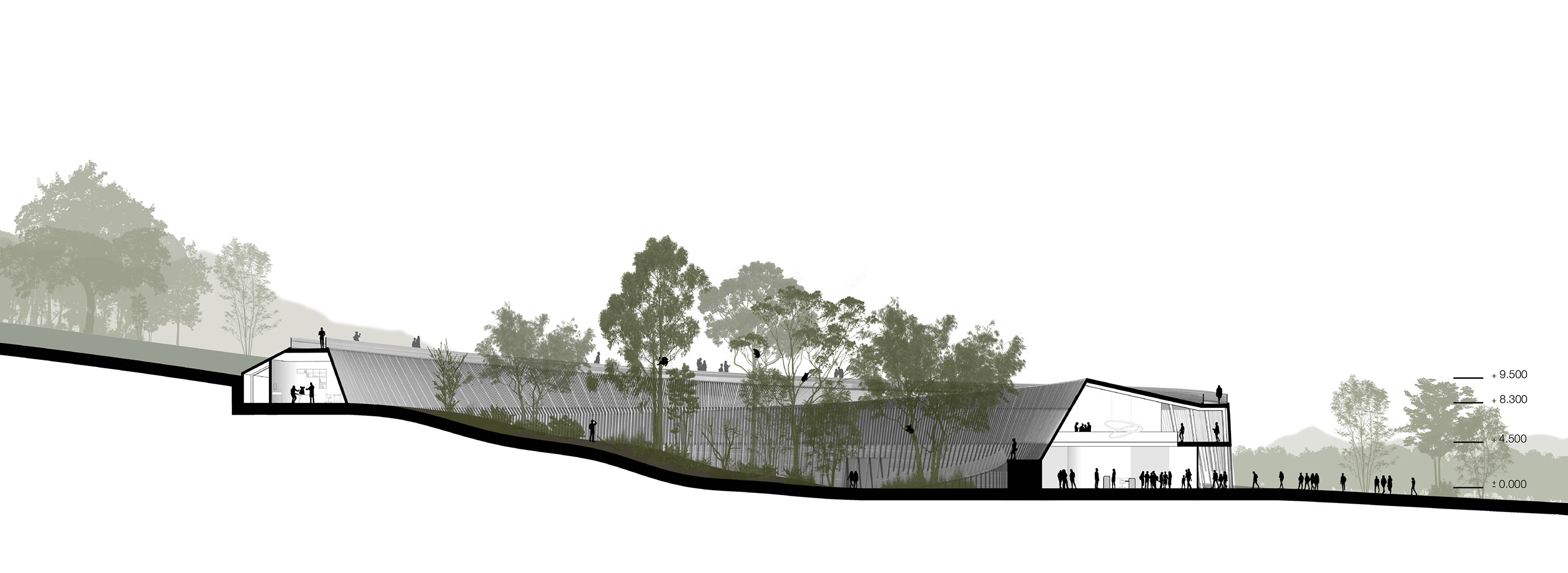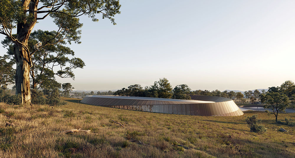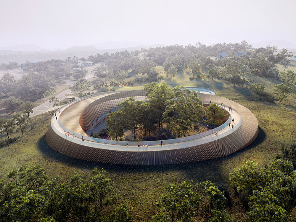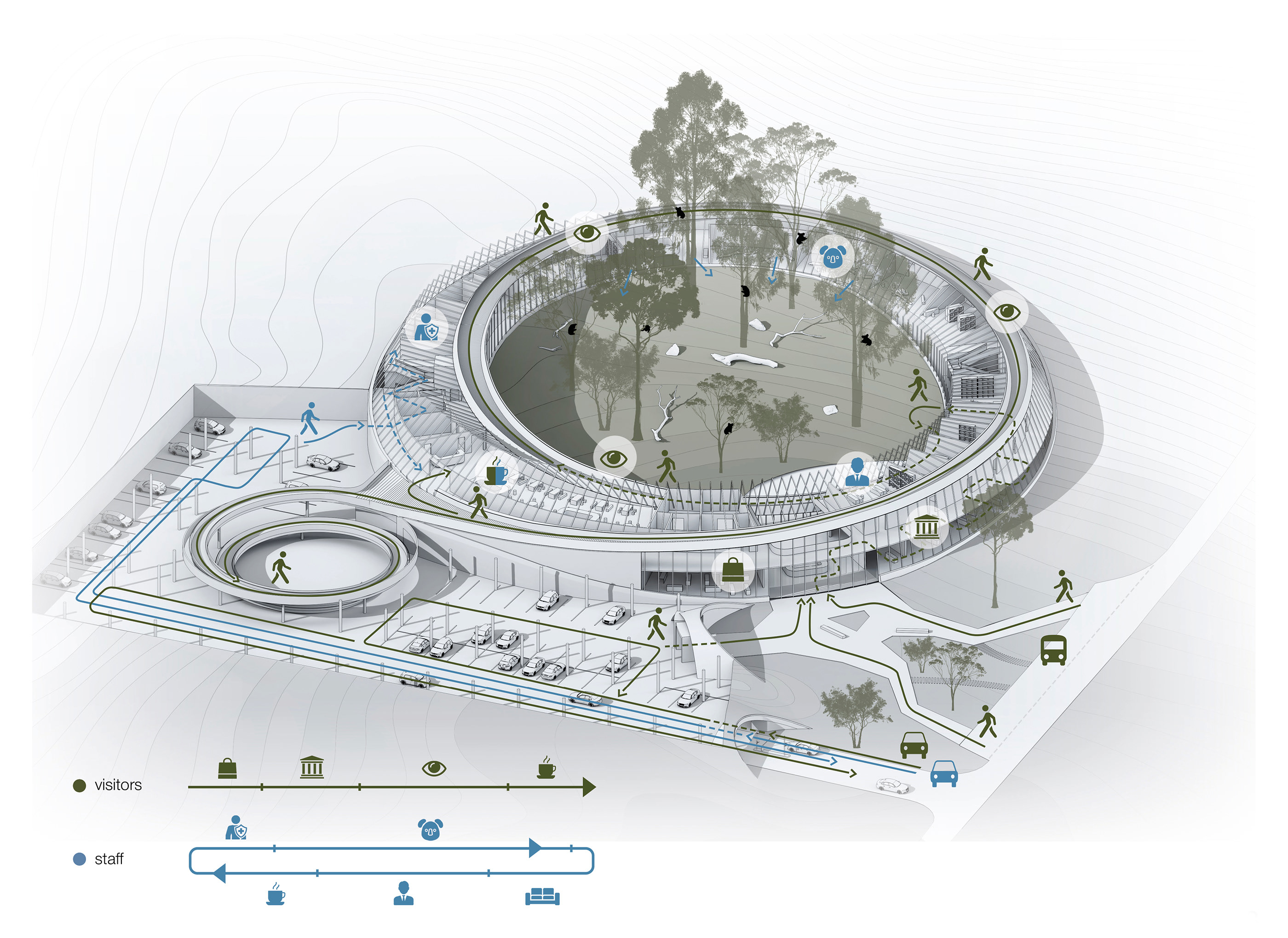 该项目的重点是创建一栋建筑物,通过和谐地融入现有自然景观中,使游客,工作人员或考拉都能沉浸在大自然中。 建筑的形状由丘陵地形决定,并受到桉树叶的扭曲启发。 带有庭院的封闭形状使考拉可以自由活动,从而为它们提供了必要的保护和照顾,而又不会束缚它们。 由于山丘地势高,院子里种着高大的树木,考拉将与周围的自然环境保持紧密的视觉联系。 螺旋坡道创造了清晰的参观场景,并为游客提供了从不同角度和高度体验考拉的机会,而不会打扰他们。