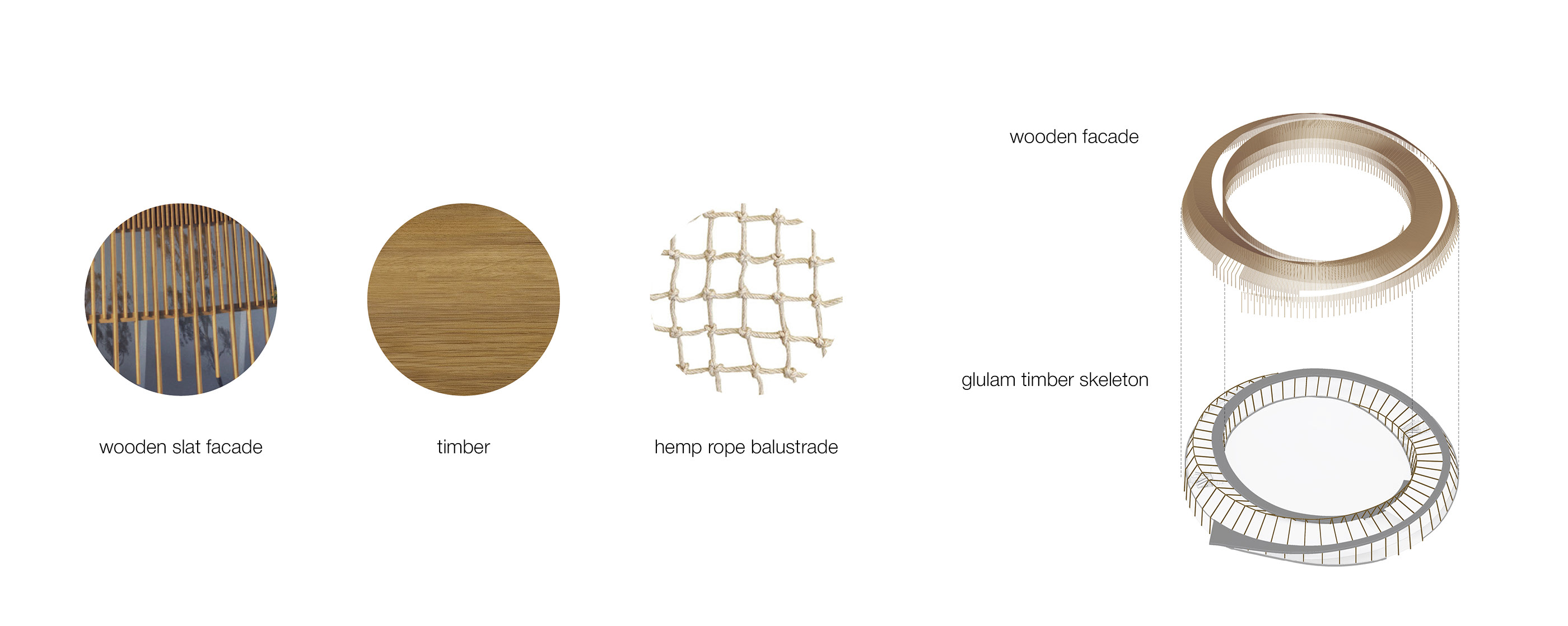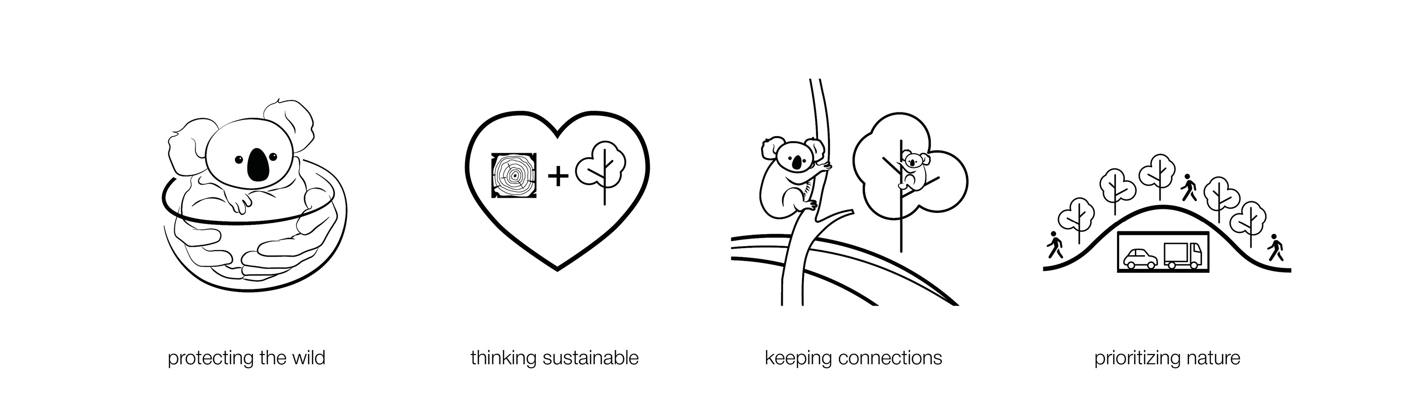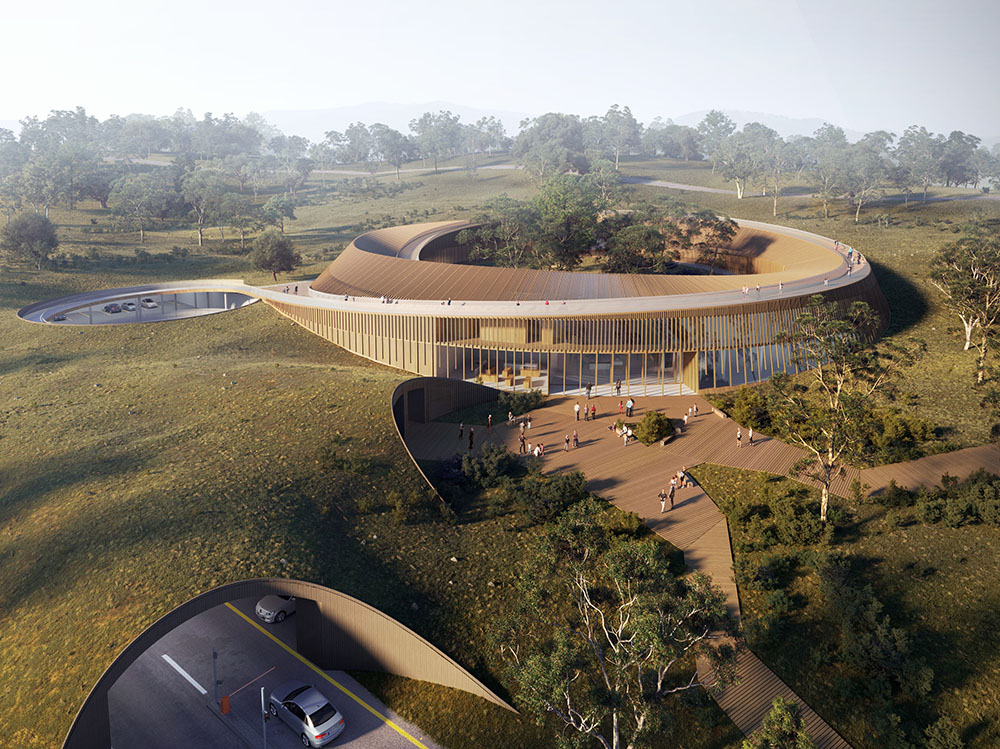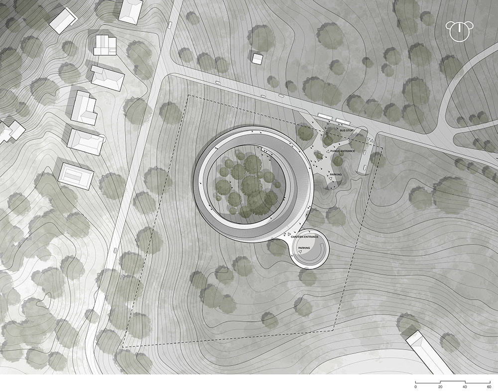 该项目的重点是创建一栋建筑物,通过和谐地融入现有自然景观中,使游客,工作人员或考拉都能沉浸在大自然中。 建筑的形状由丘陵地形决定,并受到桉树叶的扭曲启发。 带有庭院的封闭形状使考拉可以自由活动,从而为它们提供了必要的保护和照顾,而又不会束缚它们。 由于山丘地势高,院子里种着高大的树木,考拉将与周围的自然环境保持紧密的视觉联系。 螺旋坡道创造了清晰的参观场景,并为游客提供了从不同角度和高度体验考拉的机会,而不会打扰他们。