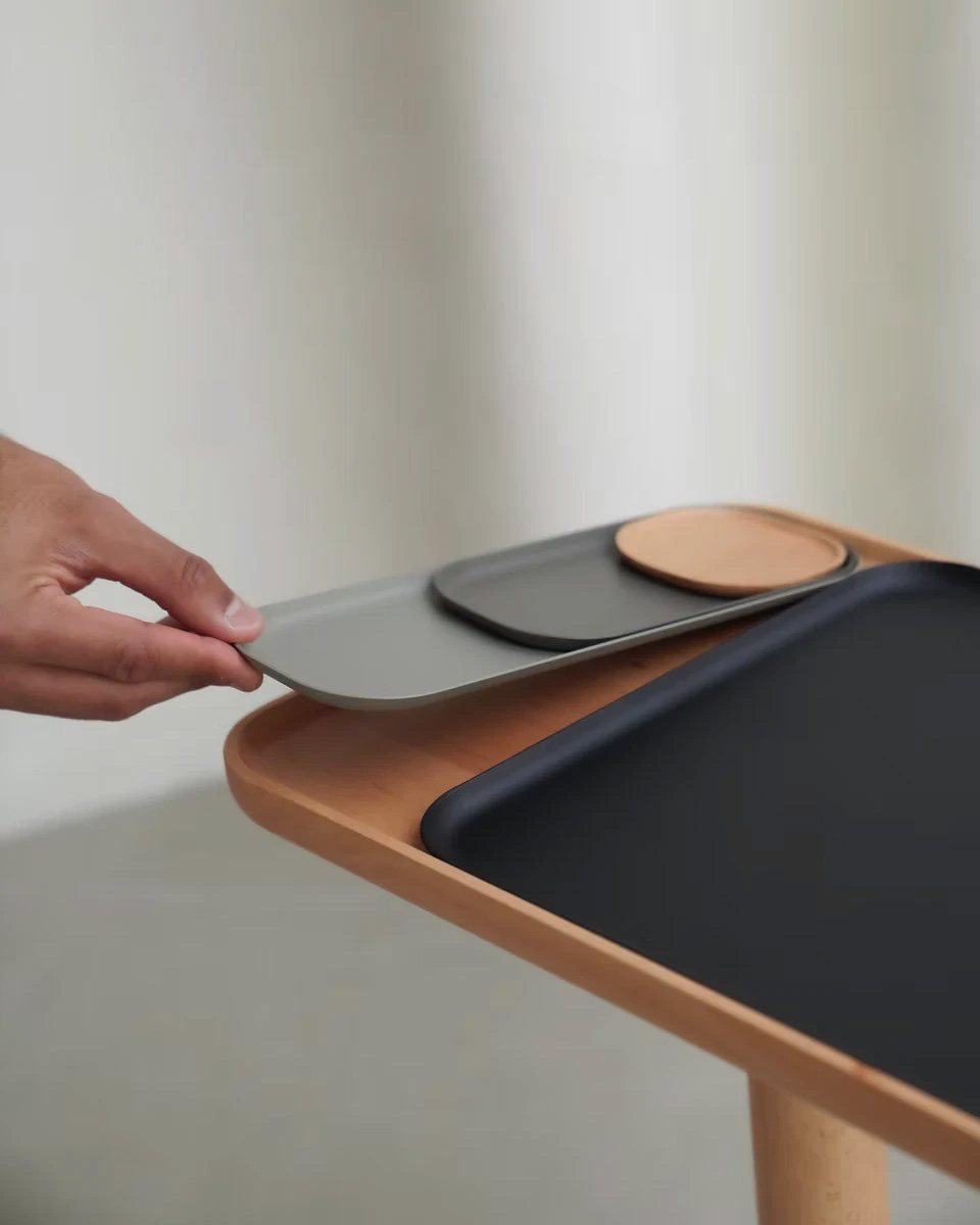此外,名为NESTING的托盘系列旨在扩展ONE BASE的产品线,其特点是可堆叠的托盘可以按尺寸排列。这些托盘的尺寸基于托盘桌面的比例面积,使其能够与托盘桌面的可拆卸托盘无缝集成。这种设计使用NESTING托盘在托盘台面上实现了各种配置,增强了使用的多功能性。
