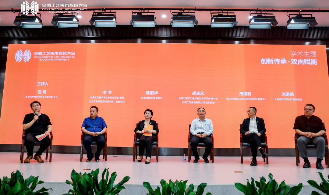 在“学术对话”下半场,中国工艺美术学会专家委员会委员李节,北京清尚建筑装饰工程有限公司董事长田海婴,中国工艺集团有限公司副总经理、中国工艺美术学会常务理事戎志宏,故宫博物院原副院长陈丽华,上海造币有限公司副总经理刘洪鹏,围绕从“思维创新”到“人文传承”的主题,聚焦于工艺美术创新思维对文脉传承的反向赋能,旨在发掘创新思维如何使手工艺教育在数字时代焕发崭新生命力。清华大学美术学院工艺美术系主任、中国工艺美术学会纤维艺术与设计专委会执行秘书长岳嵩担任学术主持。