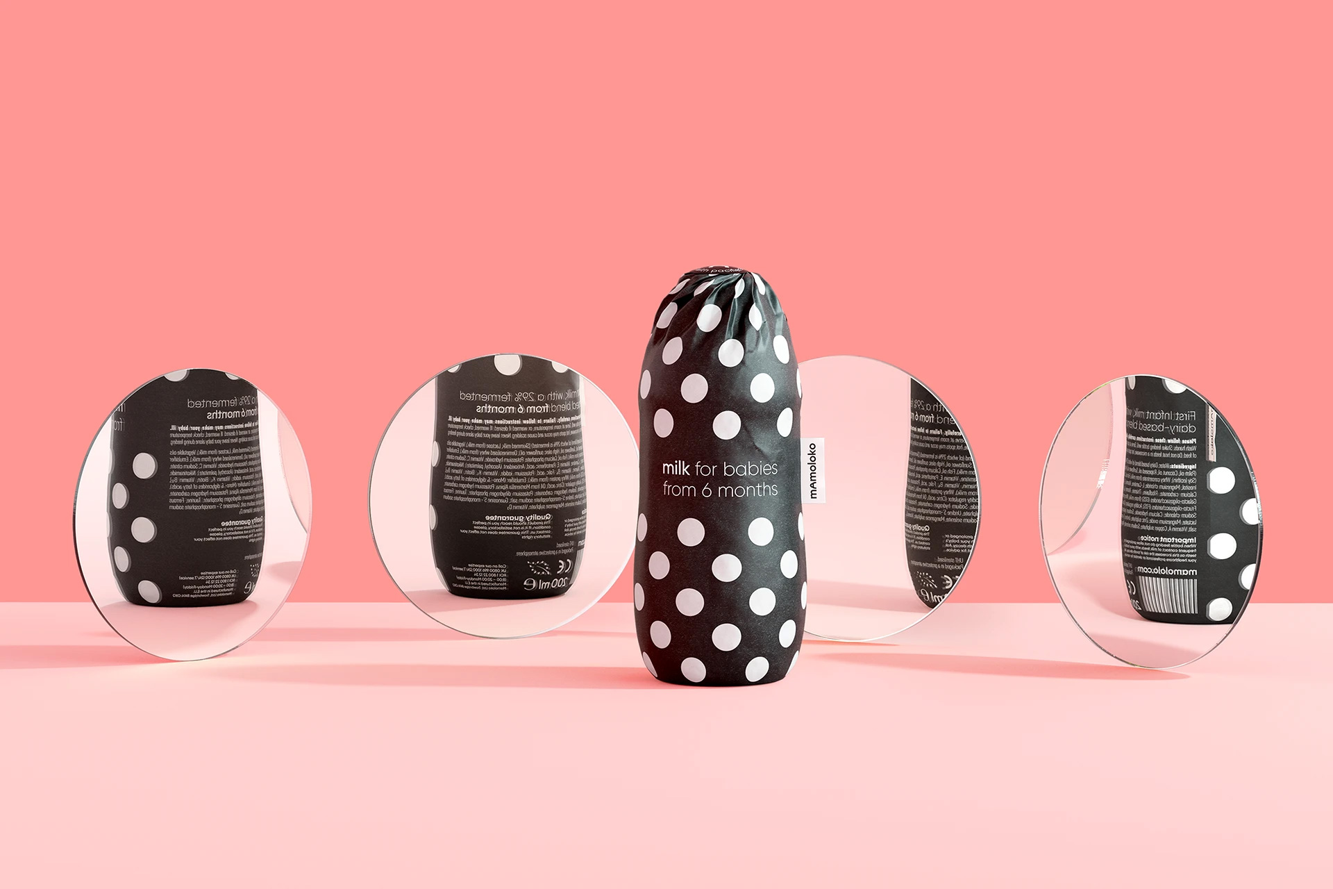 Mamoloko 是一款婴儿配方奶粉。该品牌的产品线包含三款产品,每款产品的成分不同,适用于不同年龄段:出生后、六个月和一岁。该产品的一个主要优势在于采用可重复使用的瓶装,有助于改善环境。瓶身采用定制设计,哑光肉色涂层保护内容物。瓶身配有刻度和可透视的窗口。其视觉概念是奶瓶象征着乳房,纸质包装象征着服装。产品以女性衣橱中最易辨认的圆点图案为灵感,圆点是该产品的显著特征:圆点的大小会根据婴儿的年龄而变化。标识设计为标签,强化了与服装的关联。Mamoloko 配方奶粉专为年轻现代女性设计。包装如同时尚配饰,与新妈妈的形象相得益彰。