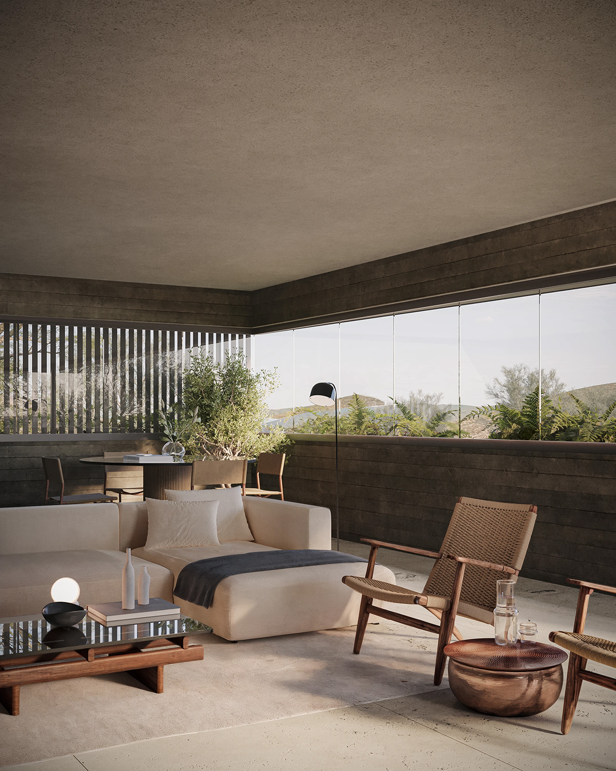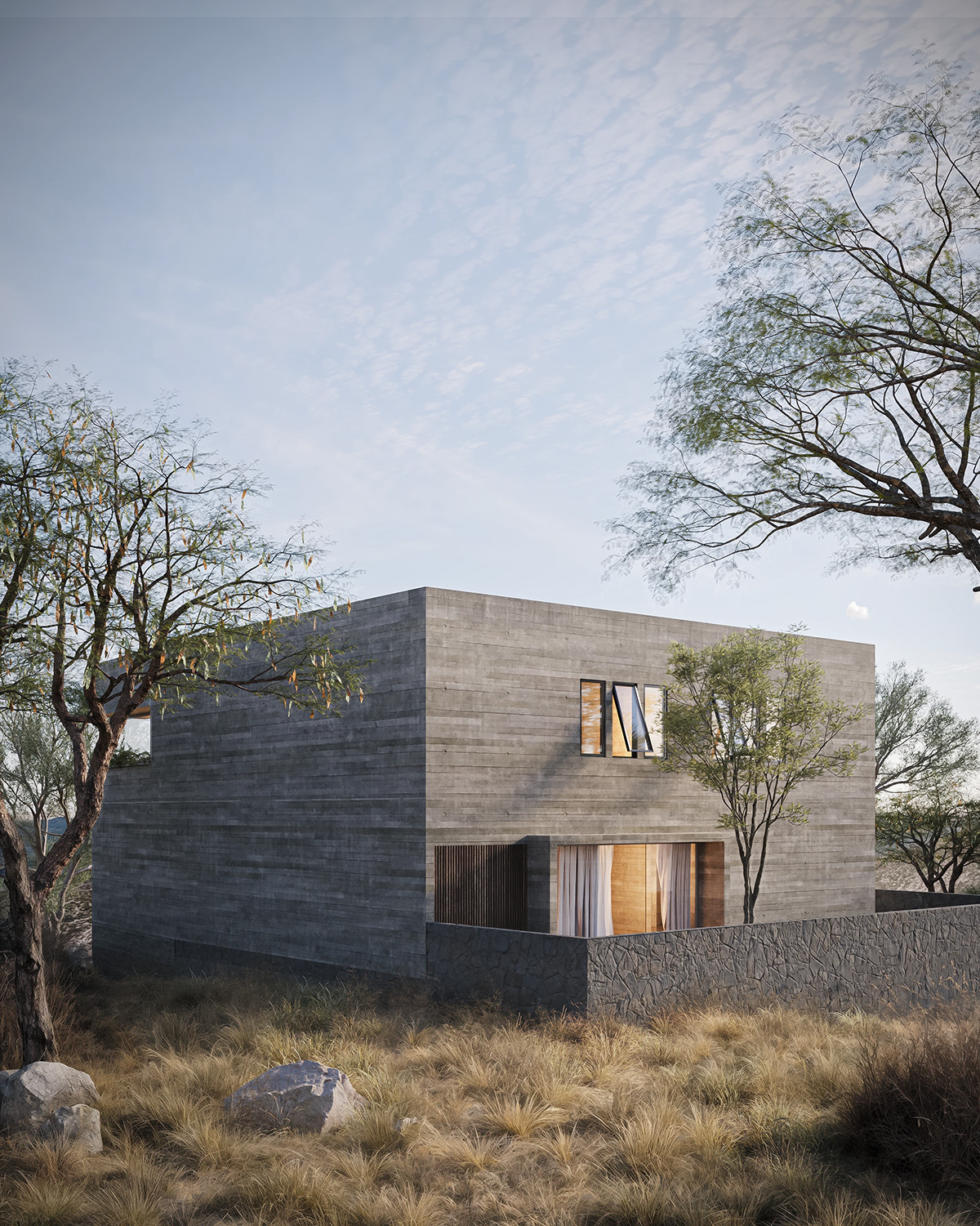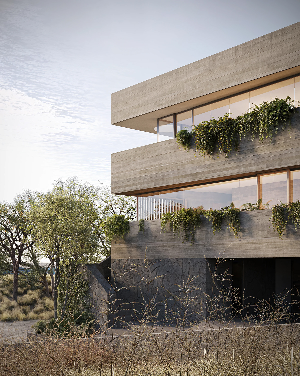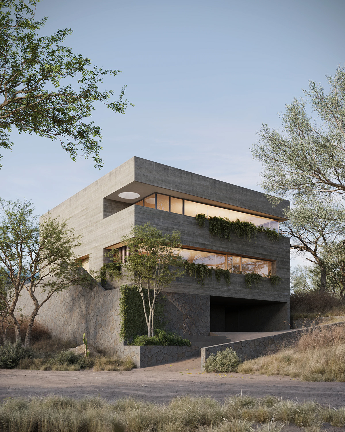 建筑师海梅·华雷斯的作品是对粗野主义的当代诠释,他将材料与形式融为一体,构建出强劲而平衡的建筑语言。住宅以石砌基座为支撑,将建筑体量牢牢地锚定于地面,赋予其稳固感,使其与自然环境和谐共存。基座之上,裸露的混凝土主体拔地而起,线条简洁有力,巧妙地设置了多个开口,引入自然光线,并将周围的景观尽收眼底。