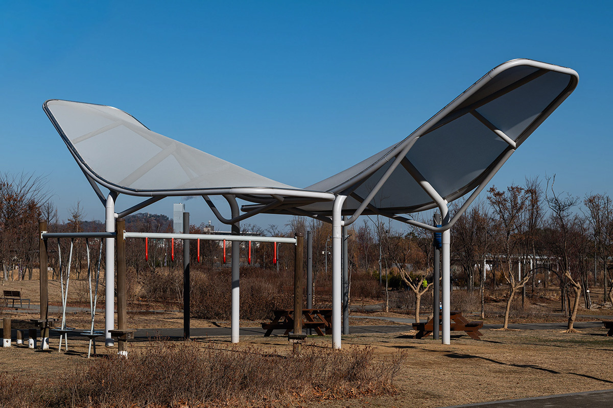 BKID 为首尔公园设计了一款装置式遮阳篷,其灵感源自鸟翼的结构。该设计兼具出色的抗风性能和轻盈的重量,适合 10 人及以上的团体使用。遮阳篷采用聚氨酯网状结构,不仅轻便,而且能够抵御台风等恶劣天气。该设计安装简便,为公共空间提供了一种实用的解决方案,使多人能够在户外活动中享受阴凉和舒适,同时兼顾耐用性和安全性。