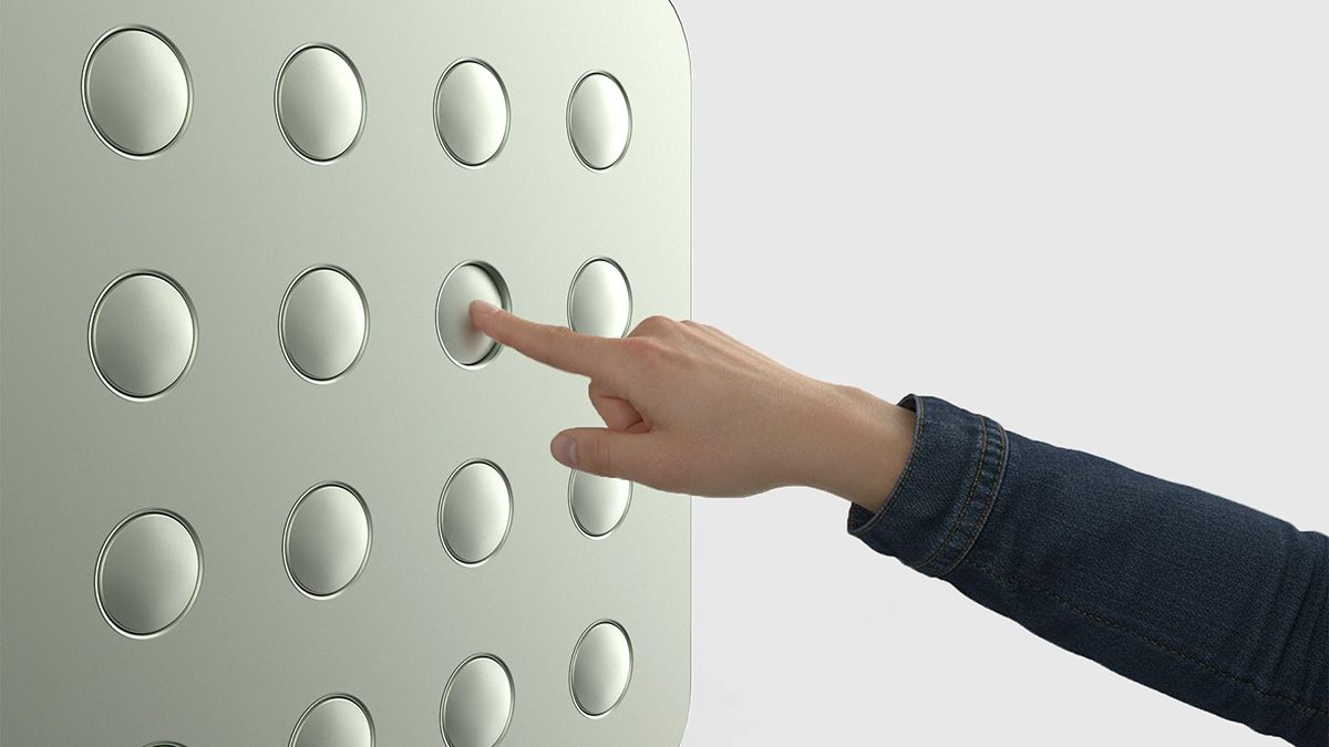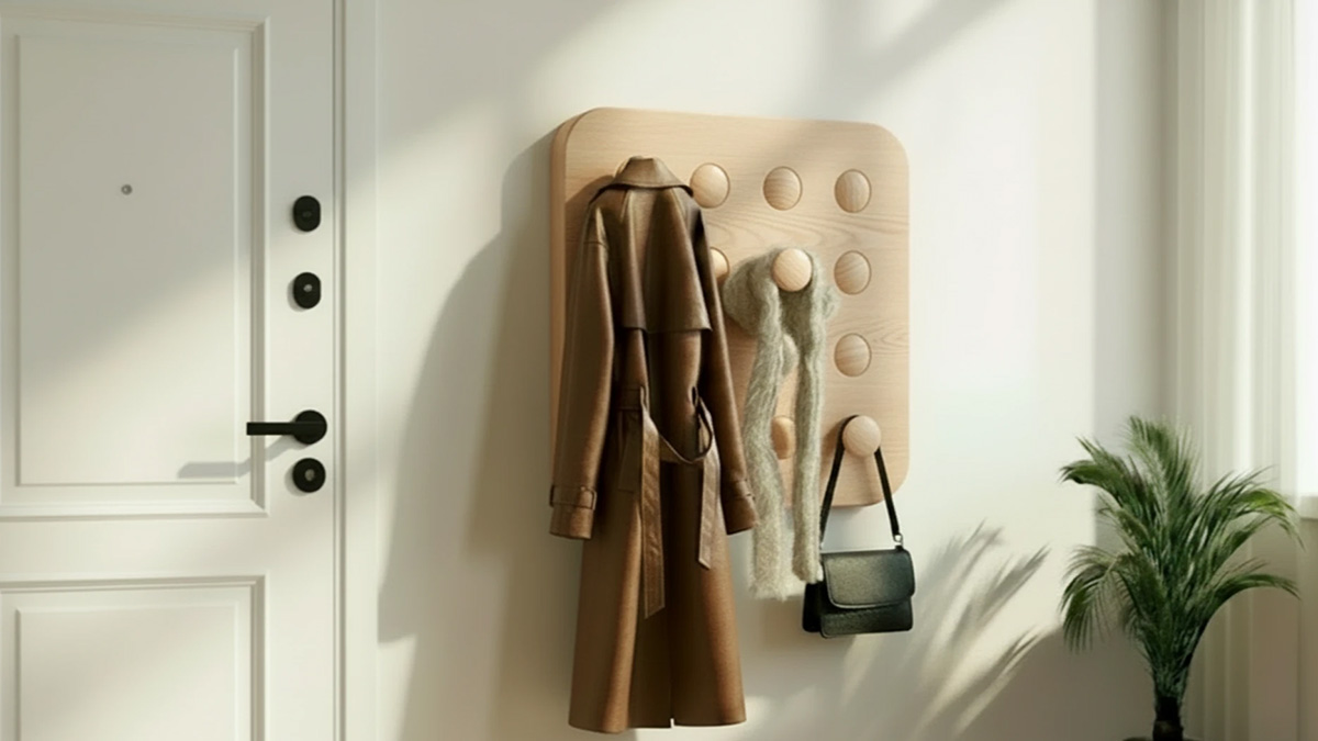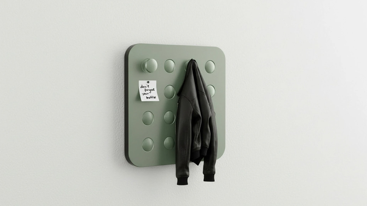 本项目探索了一种全新的壁挂式衣帽架交互方式,将极简造型、触感互动和个人收纳功能巧妙融合。设计主体为一块方形金属面板,面板上设有16个圆形按压元件。每个圆形元件均可按压向外延伸,形成悬挂点,用于悬挂外套、包袋或配饰等物品。不使用时,面板表面保持平整,视觉效果简洁。该产品专为玄关空间设计,方便用户出门前快速取用日常必需品。