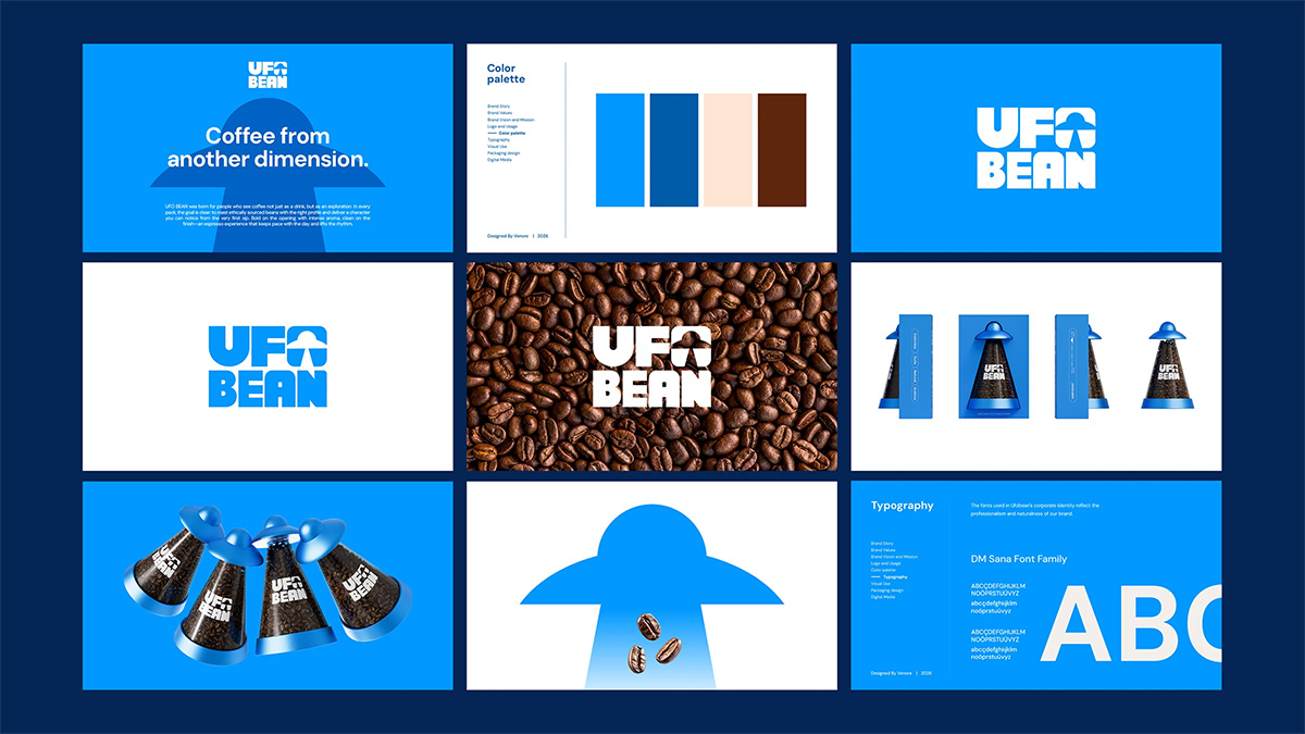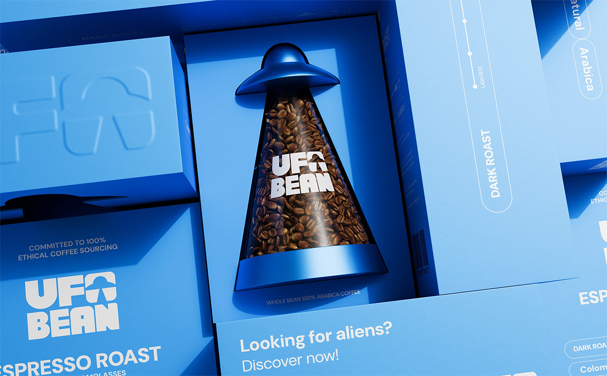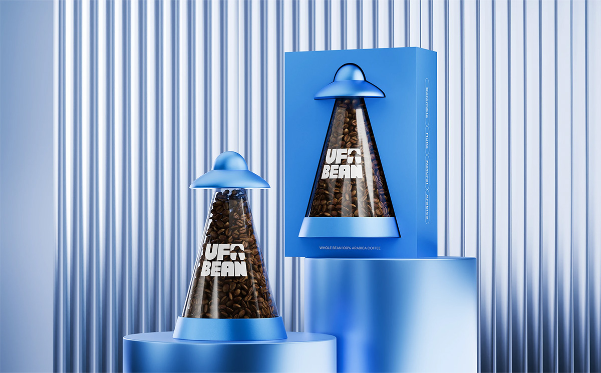 这个项目的核心在于一种打破传统包装理念的设计哲学。UFO形状的胶囊包装不仅仅是视觉上的创新;它们本身就是功能性的艺术品,能够像外太空的静谧一样,完美地保存咖啡的新鲜度。包装上锐利的几何线条和品牌专属的“太空蓝”色调,如同未来主义的UFO雕塑般矗立在您的厨房中,将冲泡咖啡变成一场视觉盛宴。