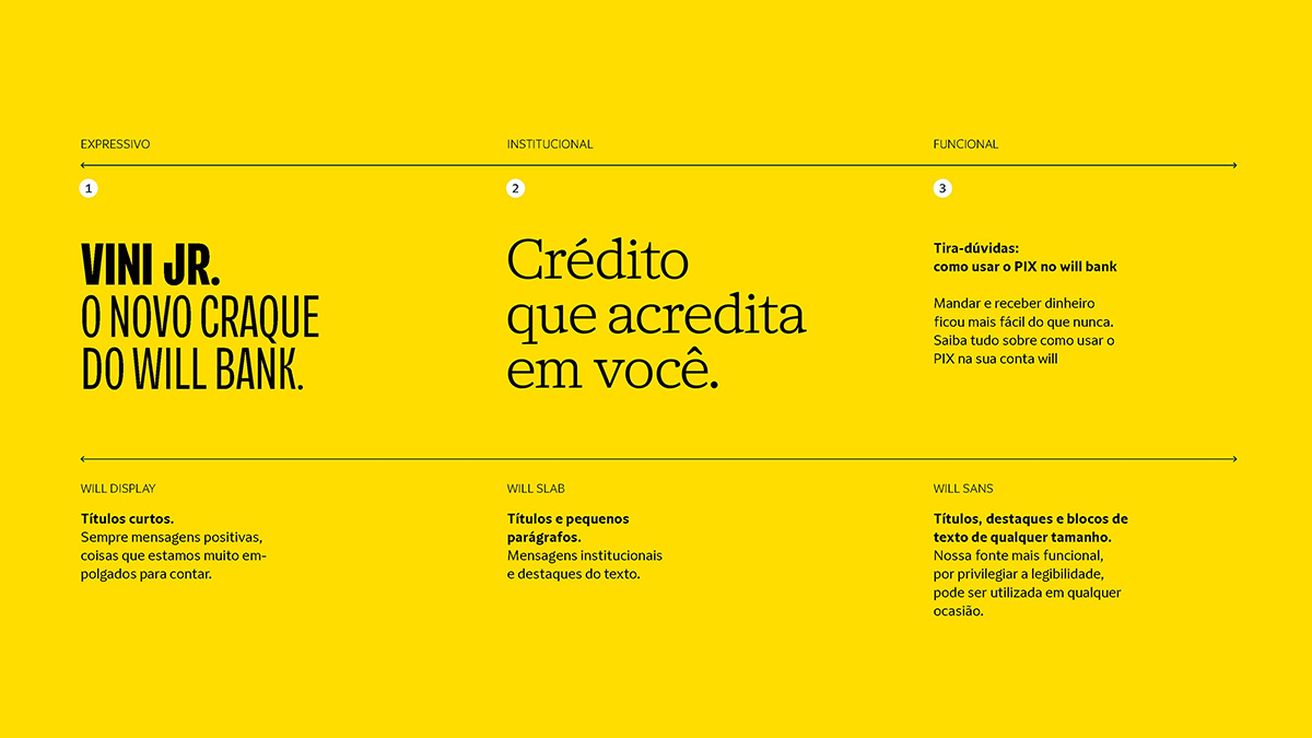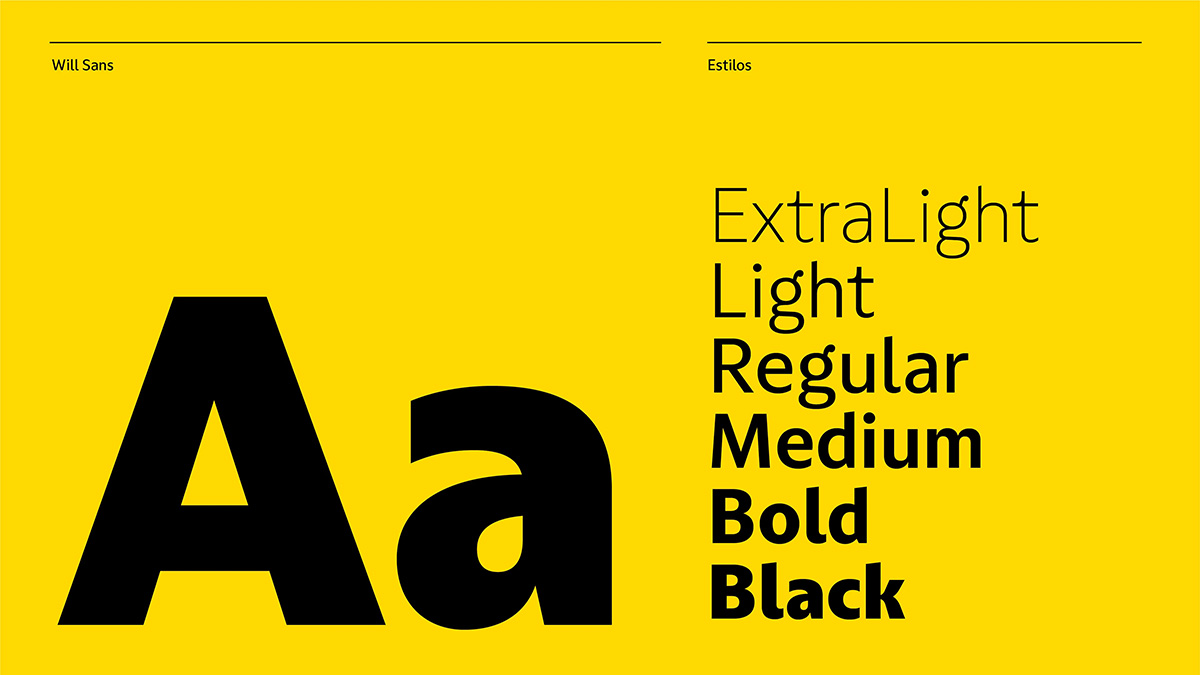 拥有近千万客户,并在巴西金融领域占据稳固地位的威尔银行(Will Bank)正迅速扩张并巩固其市场地位。为了配合这一发展势头,负责该银行品牌重塑的设计师雷南·本韦努蒂(Renan Benvenuti)邀请Plau为其打造一套专属的字体系统,以增强品牌影响力并助力其持续增长。最终成果是一个由无衬线体、粗衬线体和展示体组成的三层字体系统。无衬线体带来清晰客观的表达,粗衬线体营造信任和亲切感,而展示体则增添了威尔银行特有的活力和冲击力。每一层字体都经过精心设计,旨在强化品牌的特定方面,从安全到轻松,从合作到活力,始终与品牌的语言和文化表达保持一致。威尔银行的品牌形象不再依赖于单一字体,而是围绕着一系列能够适应不同语境的字体构建而成。这些字体层共同构成了一个灵活且富有表现力的系统。