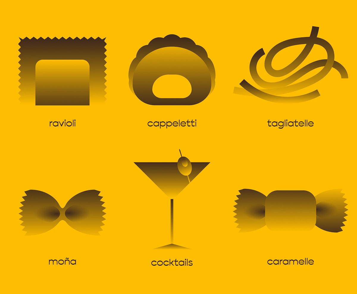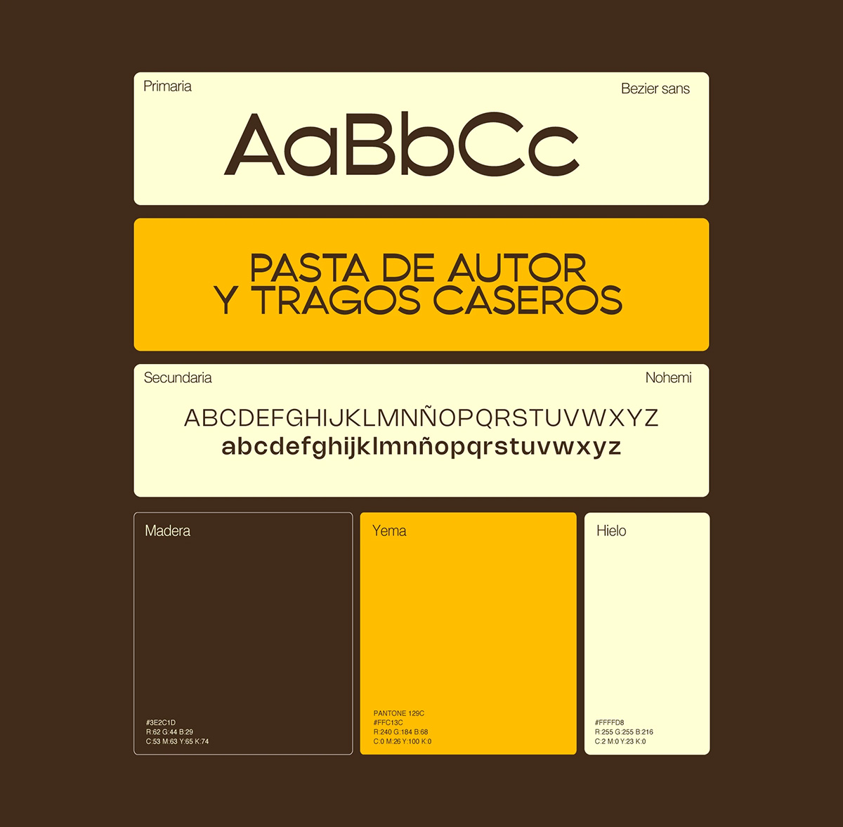 品牌标识的主色调为蛋黄色,这也是手工意面的主要原料。此外,还会使用深棕色,以呼应酒吧内的木质家具,最后,以冰白色代替白色作为浅色。整个品牌标识中未使用黑色或白色。