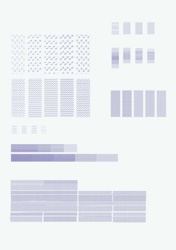 在确定了打印机在纸面留下的各种“印记”的物理意义后我将其发展成为了一套具有强大扩张潜力的视觉结构,这种结构不但使图面的视觉效果同打印机一样,而且在形式逻辑上也同它保持一致——这正是这个小项目有趣的地方:它让平面上所有的形象都用一种腔调对我们说话,图形语言自身仿佛成为了一架自行运转的机器,就象打印机自己一样。