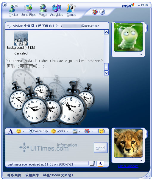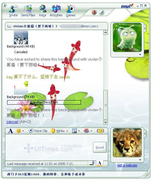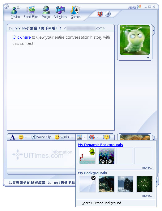 除了7.0版本当中已经出现的动态头像,MSN Messenger 7.5版本开始加入对动态聊天背景(场景)的支持。另外,在表情,背景,Winki,礼包等按钮中,都增加What’s hot(当前热门)显示,供用户选择最热门的元素。
