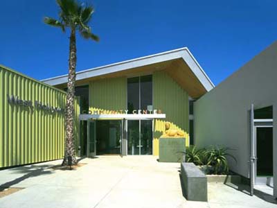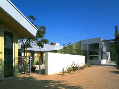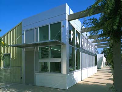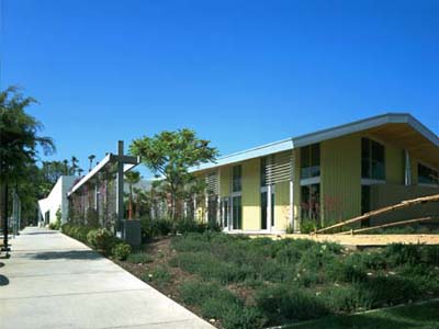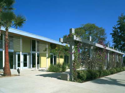 The site design strategy began with the idea of a 'car park' that conceptualizes parking as green space for cars and an interest in making the parking lot a demonstration project of environmentally responsive storm water disposal. The ground surface of decomposed granite allows water to percolate to the water table and continuous tree canopy and hedges use landscape to define spaces. A ‘park pavilion’ roof unifies the single story building design. Each end of the building is anchored by one of the two main user groups - seniors and teens.