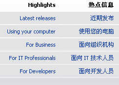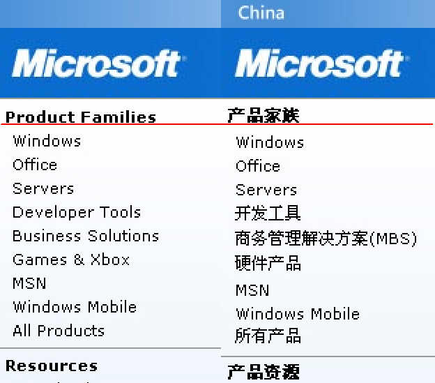 MicroSoft中国这个情况还不是很严重,但仍然出现像“开发工具”、“商务管理”、“所有产品”这样的词。