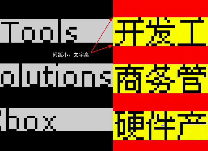 看到吗?中文比英文要高(黄色VS灰色),但是行间距反而更小(红色VS黑色)。