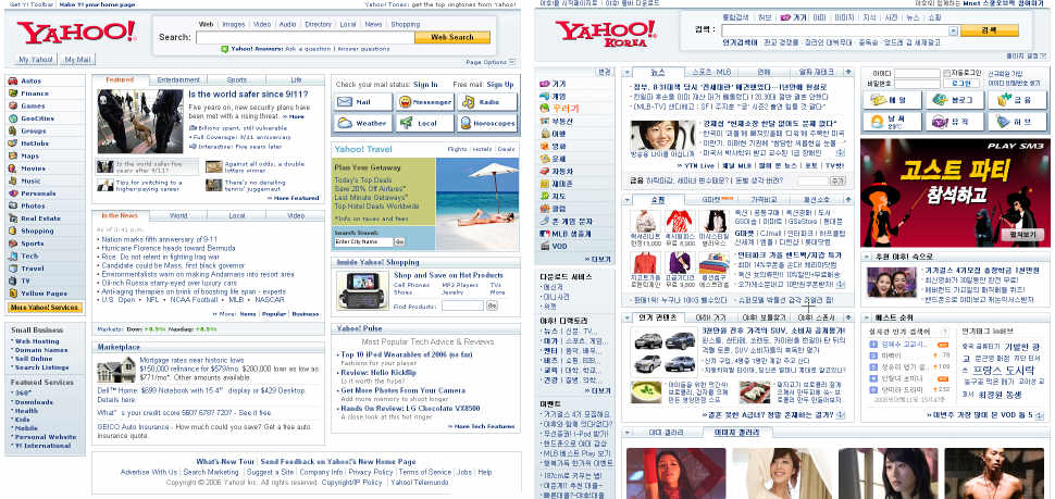 这次我选择新版的Yahoo EN和Yahoo韩国(为什么不选Yahoo中国?嗯……因为我写这个的时候它还没有改成新版),韩文、日文和中文都很相似,虽然不是严格的横平竖直的方块,但每个字仍然是具有固定比例的。(从这个程度上来讲,中文的情况会比韩、日文更加突出)