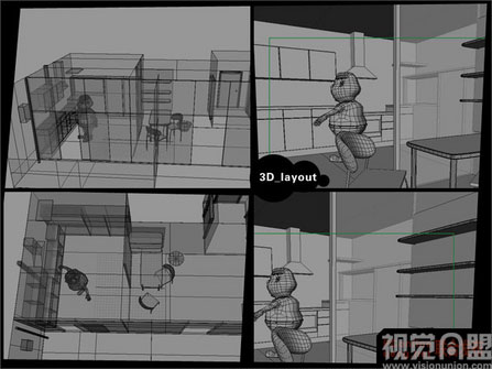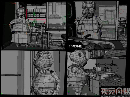 04. 3D粗模——在三维软件中由建模人员制作出故事的场景、角色、道具的粗略模型,为Layout做准备。
