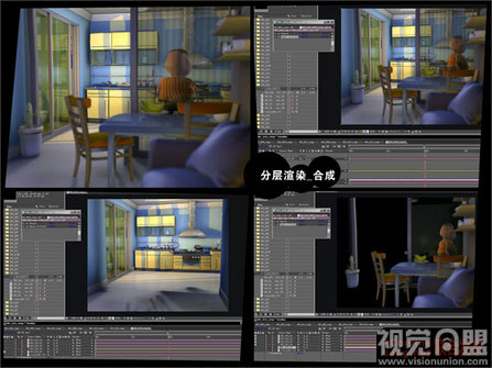 12.分层渲染/合成——动画、灯光制作完成后,由渲染人员根据后期合成师的意见把各镜头文件分层渲染,提供合成用的图层和通道。