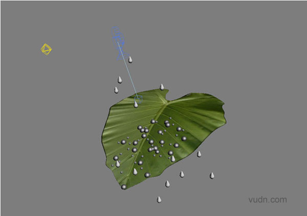 3.场景设置 -水滴- 复制水滴模型,缩放成不同的大小,随即摆放位置。在1-100帧的范围内设置它们落向树叶的动画,不用太快,用于生成 motion blur 效果。