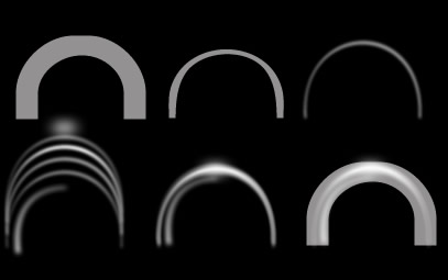 克隆几个刚得到的这个图形,做条状渐变,调节节点使左右两边的不透明度,然后绘制左侧的高光形状,调整好他们的位置,然后把高光部分放到锁头上,得到右边的锁头。