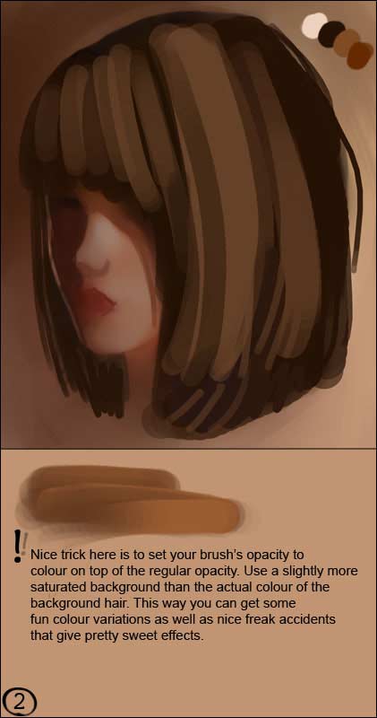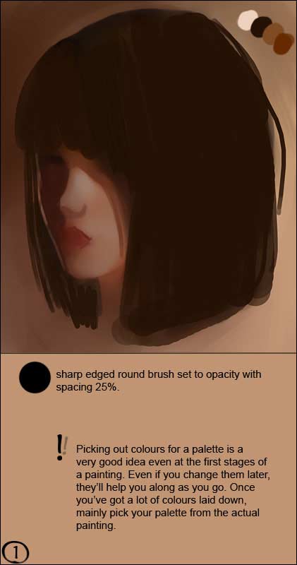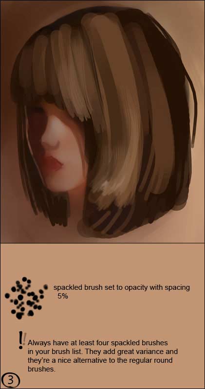 学习技艺家们更多的数字绘画技巧:《Digital Painting》,由艺术大师Linda Bergkvist、Philip Straub、 Rob Chang和John Wallin Liberto编著的权威指南书籍。 指导: 首先需要确定头发的颜色,这里描绘的是稍显金黄的褐色头发,在最暗的色彩中选择全黑。即使你以黑色基调来描绘闪亮的金发,也不要把埋植的黑色弄得太淡。一旦选好色彩(一个高亮色、一个作阴影色、两个作混合色),便开始草拟头发的形状。