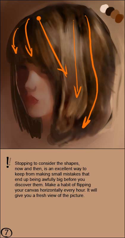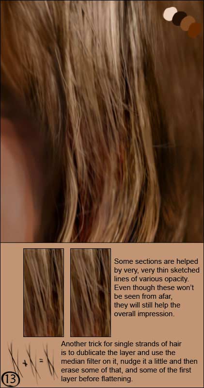 指导 纹理,纹理,还是纹理。一旦头发的飘动做好后,就要进行纹理处理工作。把这些杂乱的头发描绘成一个精美的发型的最好方法:一根一绺的精心描绘、叠加, 然后创造一个新层,描绘、叠加。以不同的色彩叠加五层,把它们设置成不同的透明度,使用smudge或blur工具进行模糊化处理。