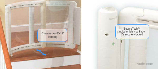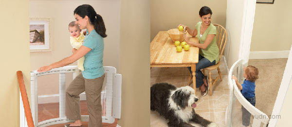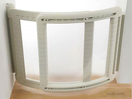 Curve Gate 来自婴儿产品集团 Dorel Juvenile Group 下的 Safety 1st,生产家庭用的安全婴儿产品,比如楼梯安全门。Curve Gate 是 Safety 1st 楼梯安全门系列产品中的一个,长度71-101cm左右,高度78cm,弧线型的设计能够为安全门的内侧腾出一些空间,带来更多的安全性,比如安装在楼梯下面的时候,可以避免很多人抱着小孩站在第一级楼梯上开这个安全门,也可以让小孩更远离楼梯,无论是楼梯上端还是下端,同时当它安装在房间之间的时候,可以成为小孩的观景台,比如可以看家长做饭什么的。安全门上有一个指示器用来查看门是关上的还是打开的。售价60美元。