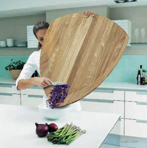 Eva Trio Kite砧板来自Eva Solo 的兄弟品牌Eva Trio ,设计来自丹麦的Storm Design,获得IDEA 2008 Home Living 类铜奖。这是一个有倾角和围栏的砧板,这个倾角能收集汁液,围栏组成的角就成为一个倾倒的注口,让你放心的切菜切肉。